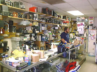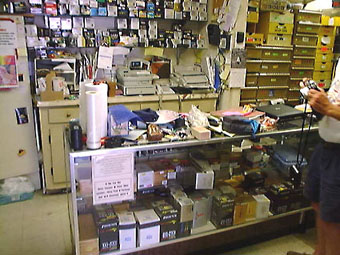 店内の様子は写真の通りで、かなり雑然としています。価格は中古カメラブームの続く日本の店よりも2-3割は安いのが魅力的です。私がいる間に二人の客が来ましたが、その内の一人はヤシカ・エレクトロ35を持ち込んで相談していました。どうやら電池切れですが、水銀電池ケースが腐食しているようで、Amyが手早く清掃して電池を入れると息を吹き返しました。面白いのは、コインで開ける電池ケースのキャップを開ける専用の道具があったことで、Amyのお父さんが自作したものらしい。